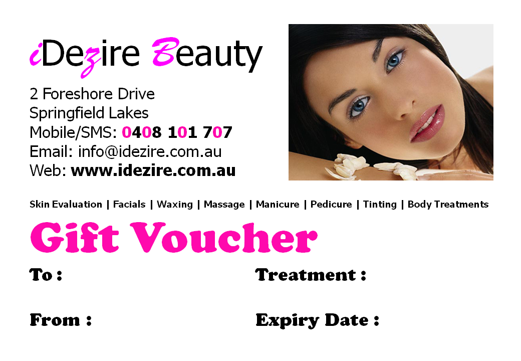 Mother’s Day Gift Voucher “Like “and “Share” this post on your facebook timeline and get 15% off for iDezire beauty treatments. Mothers Day Gift Vouchers are available now. Click for pricing of iDezire beauty treatments. Offer valid till Mother’s Day (Sunday, 8 May 2016)